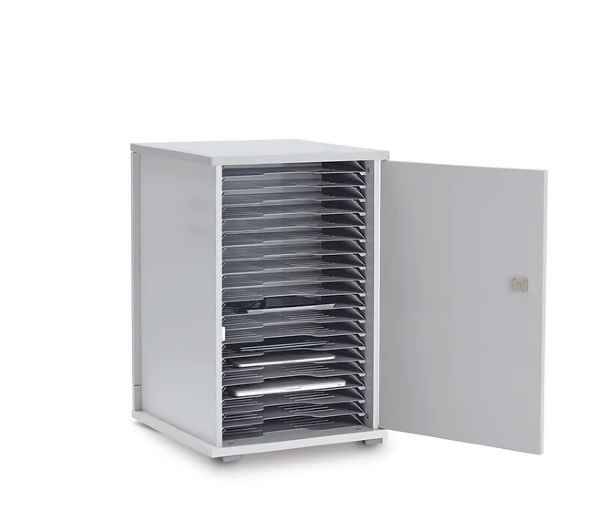- Horizontale opslag: Apparaten worden horizontaal opgeborgen in ruime compartimenten, geschikt voor 15,6-inch laptops, tablets of Chromebooks, met voldoende ruimte voor beschermende hoesjes.